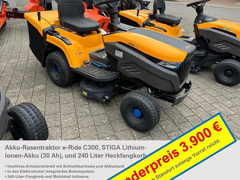 Der Akku-Rasentraktor e-Ride C300 bietet genau die richtige Mischung aus Leistung und Vergnügen. Dieser robuste Aufsitzrasenmäher wird von einem leistungsstarken STIGA Lithium-Ionen-akku (30 Ah) angetrieben. Das Ergebnis: Mäht Rasenflächen von bis zu 3000 m² und läuft bis zu 45 Minuten lang mit nur einer Akkuladung. Zudem ist im Lieferumfang ein geräumiger 240-Liter-Fangkorb enthalten.