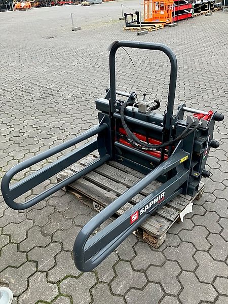 Die SAPHIR-Quaderballenzange QBZ eignet sich zum Transport von Quader- und Silageballen. Klemmbügel und Gerät sind so konstruiert, dass eine Beschädigung von Folienballen ausgeschlossen ist. Durch die zwei doppeltwirkenden Hydraulikzylinder arbeiten beide Seitenarme unabhängig. Es wird immer der Seitenarm bewegt, der nicht am Ballen anliegt, sodass kein Verschieben der Ballen auf dem Boden erfolgt. Ein enges Stapeln der Ballen ist somit ebenfalls möglich. Durch die langen Klemmbügel können Quaderballen auch längs aufgenommen werden.